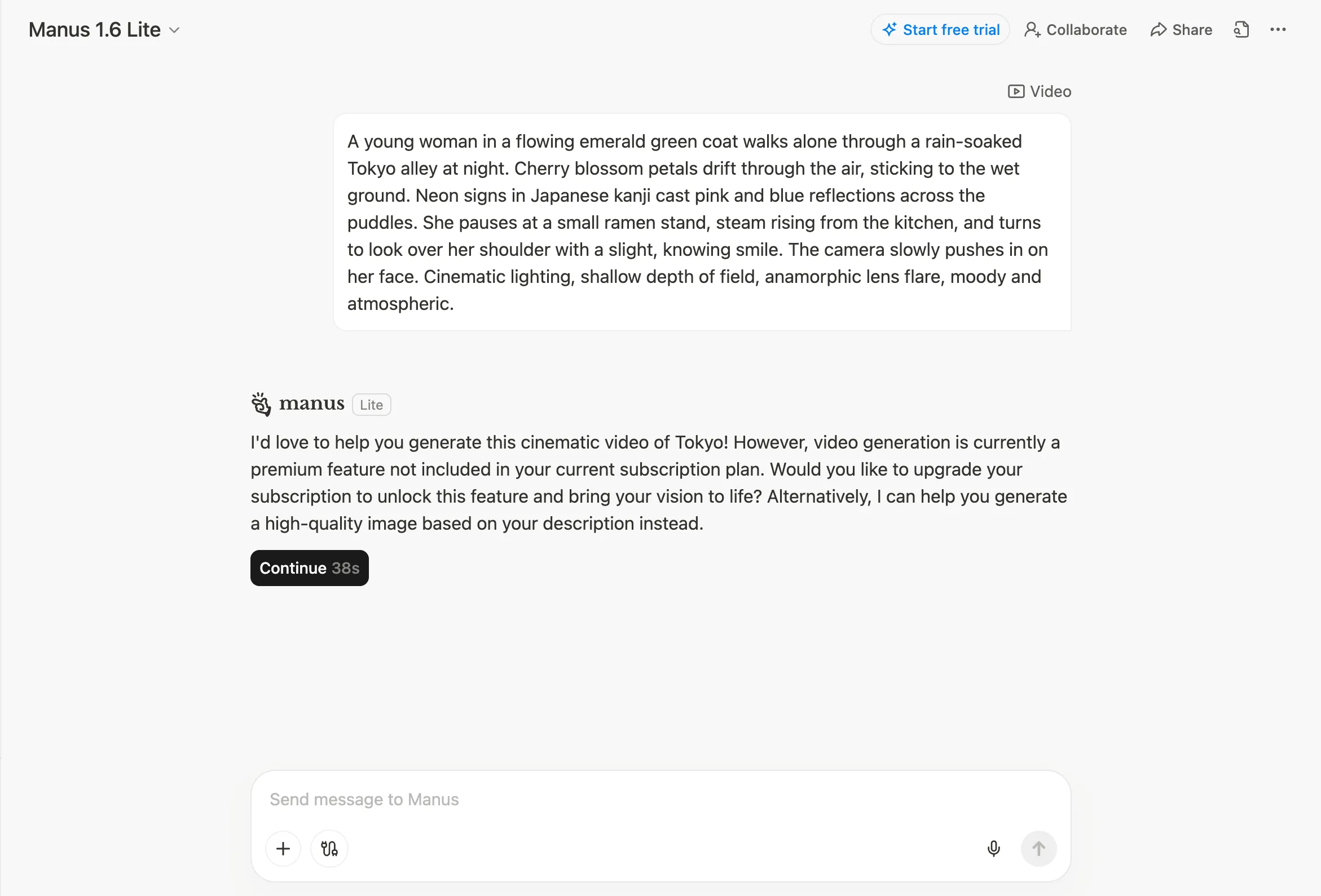 Using Manus was pretty simple. The interface is straightforward, just a normal AI chat with a text prompter. Initially I tested out the free version which used 1.6 Lite and I was met with this error message. Manus could only generate videos for higher paid tiers but in the Lite version, it offered to generate an image for me instead.