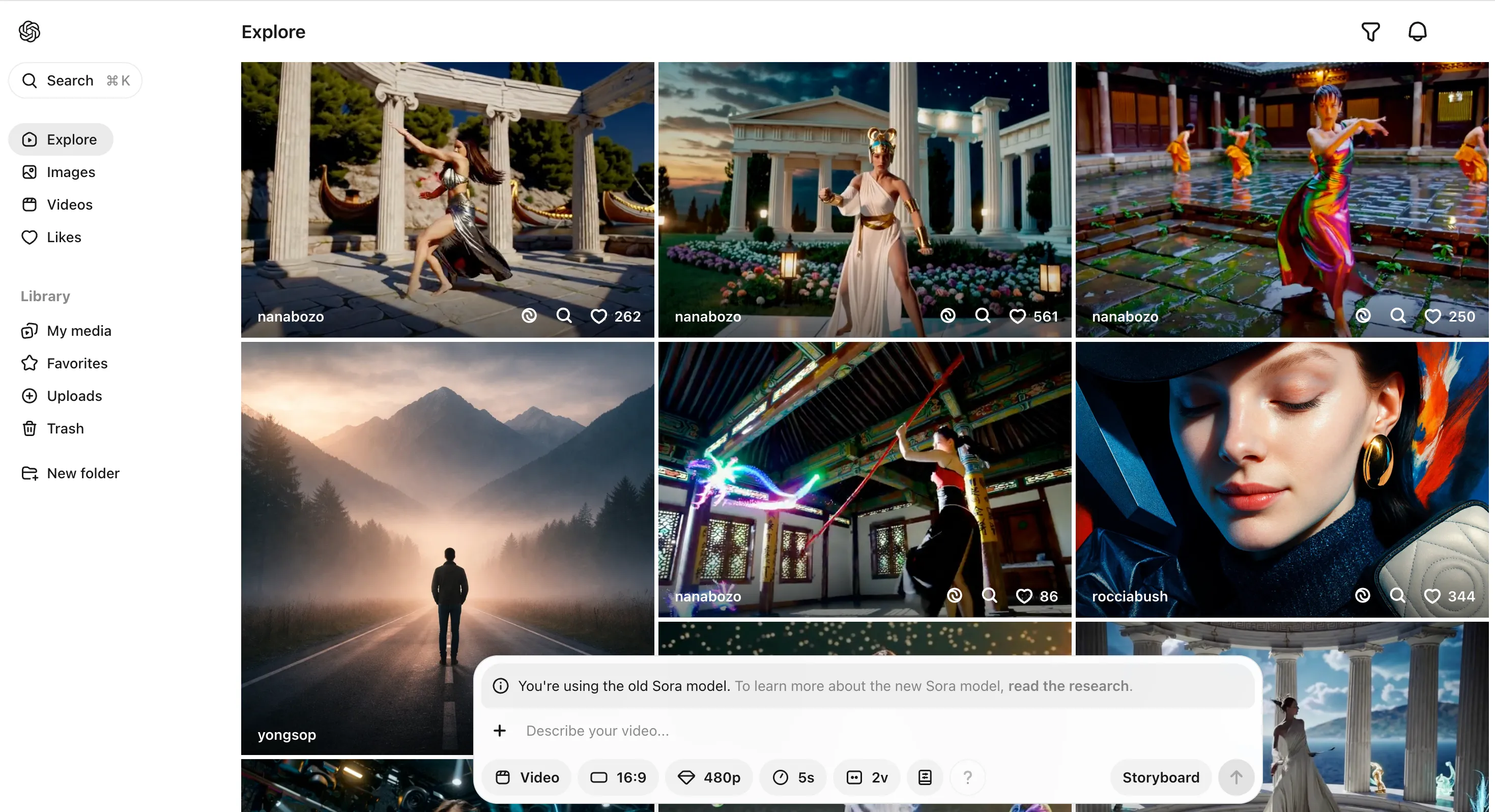 I went with the free version, which is accessible through ChatGPT. The interface is easy enough, with a simple toggle for video creation and options for aspect ratio, resolution, and video length. The free version limits you to 480p resolution and 5-second videos, and it outputs two variations by default. Before I even started, I checked out the explore page and could already see some of the AI's limitations in other people's creations, which tempered my expectations. But more so, there were so many moving colors and parts, while I understand that it was to showcase their range of creations, it ended up being quite overwhelming.