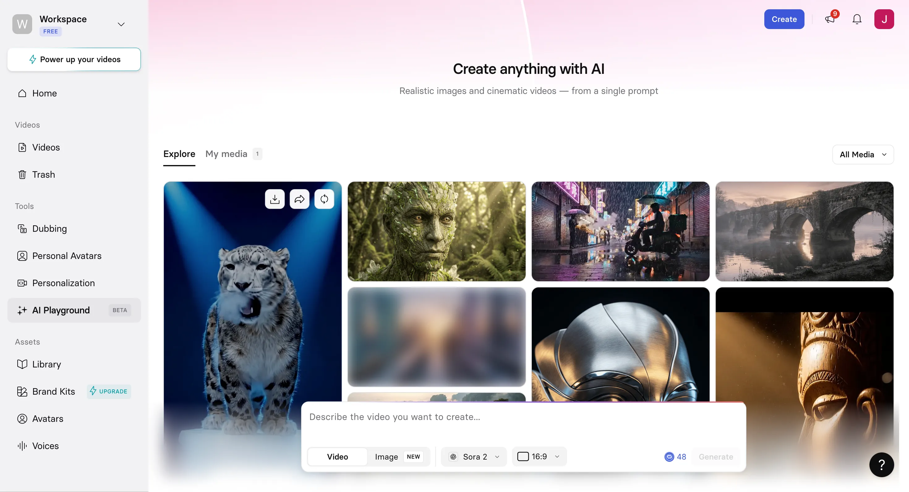 There's a video library for organizing your content and an AI Playground tab with example videos for inspiration. The prompt box is straightforward, with options for model choice (Veo or Sora) and aspect ratio.