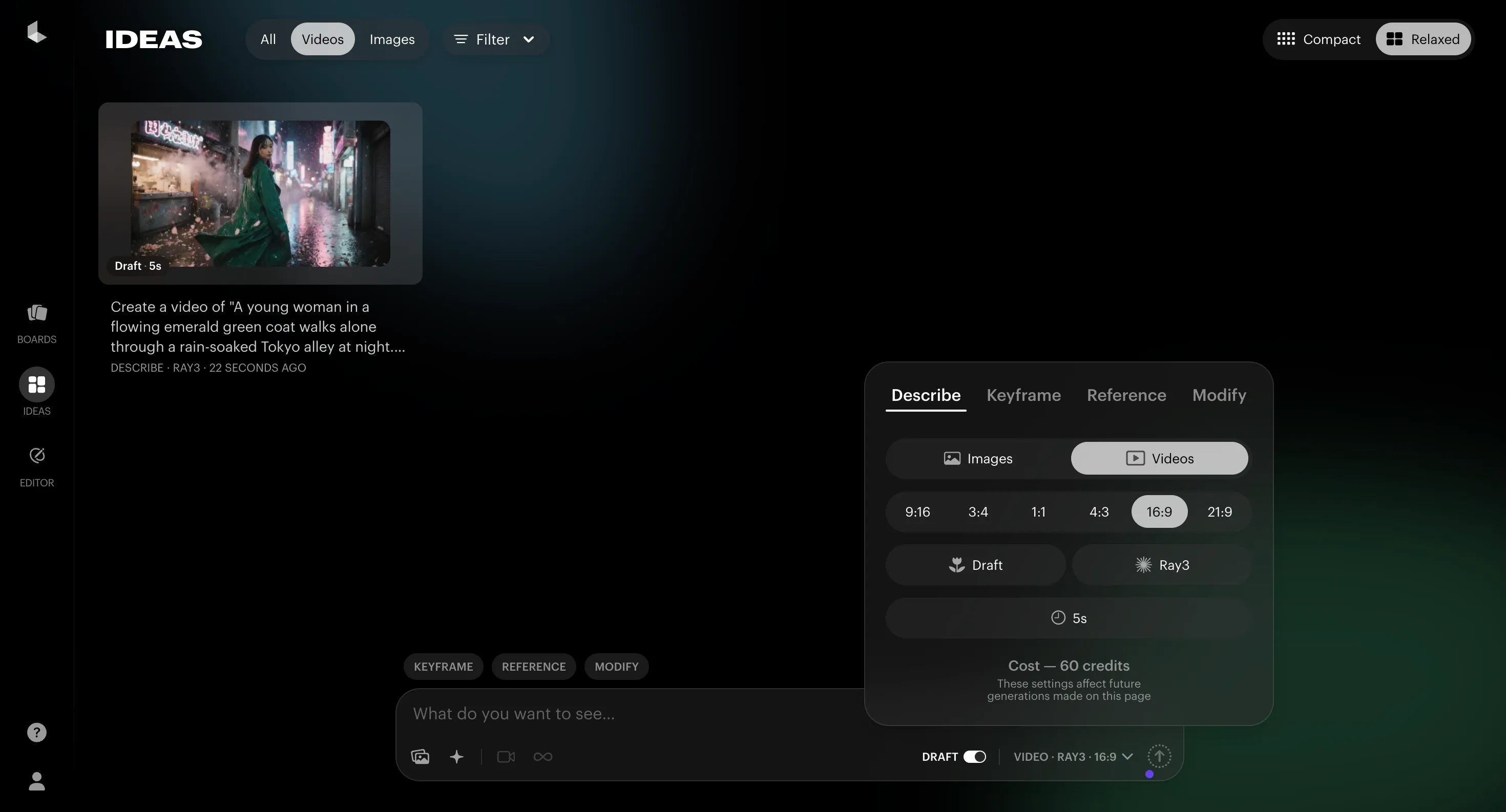 I started with the free version, which limits you to Ray 3, 5-second videos in draft quality with a Luma watermark. The interface has an Ideas tab for prompt entry, with options for aspect ratio, version (Ray 2 or Ray 3), and duration. There's also a helpful library of shots, camera angles, styles, and lighting for inspiration. One standout feature is the key frames option, where you can upload start and end images and let the AI fill in the middle.