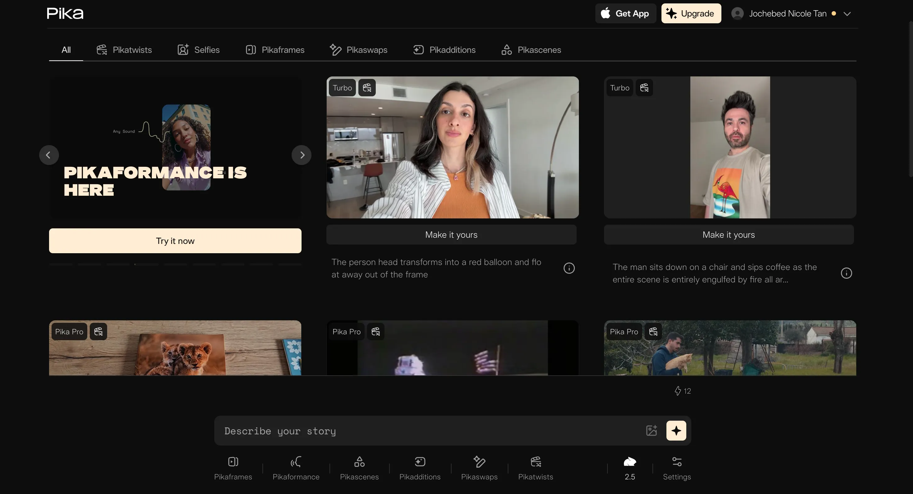 There are a lot of elements, and I wasn't sure where to input my prompt initially. There's Pikaframes (upload start/end frames and the AI creates the in-between), Pikaformance (talking head with avatar), Pika Additions (add things to a preexisting video), Pikaswaps (swap characters or objects), and Pikatwists (add a twist to a character or object). It's a lot to take in. I ended up just using the basic prompt feature without any of the special add-ons.