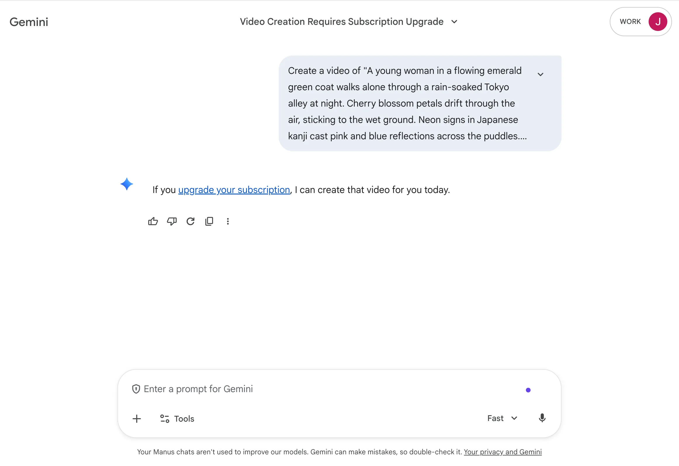 There's no free version for Veo 3 video generation, so I had to upgrade to test it. When I tried prompting Gemini without a subscription, it just threw an error telling me to upgrade.