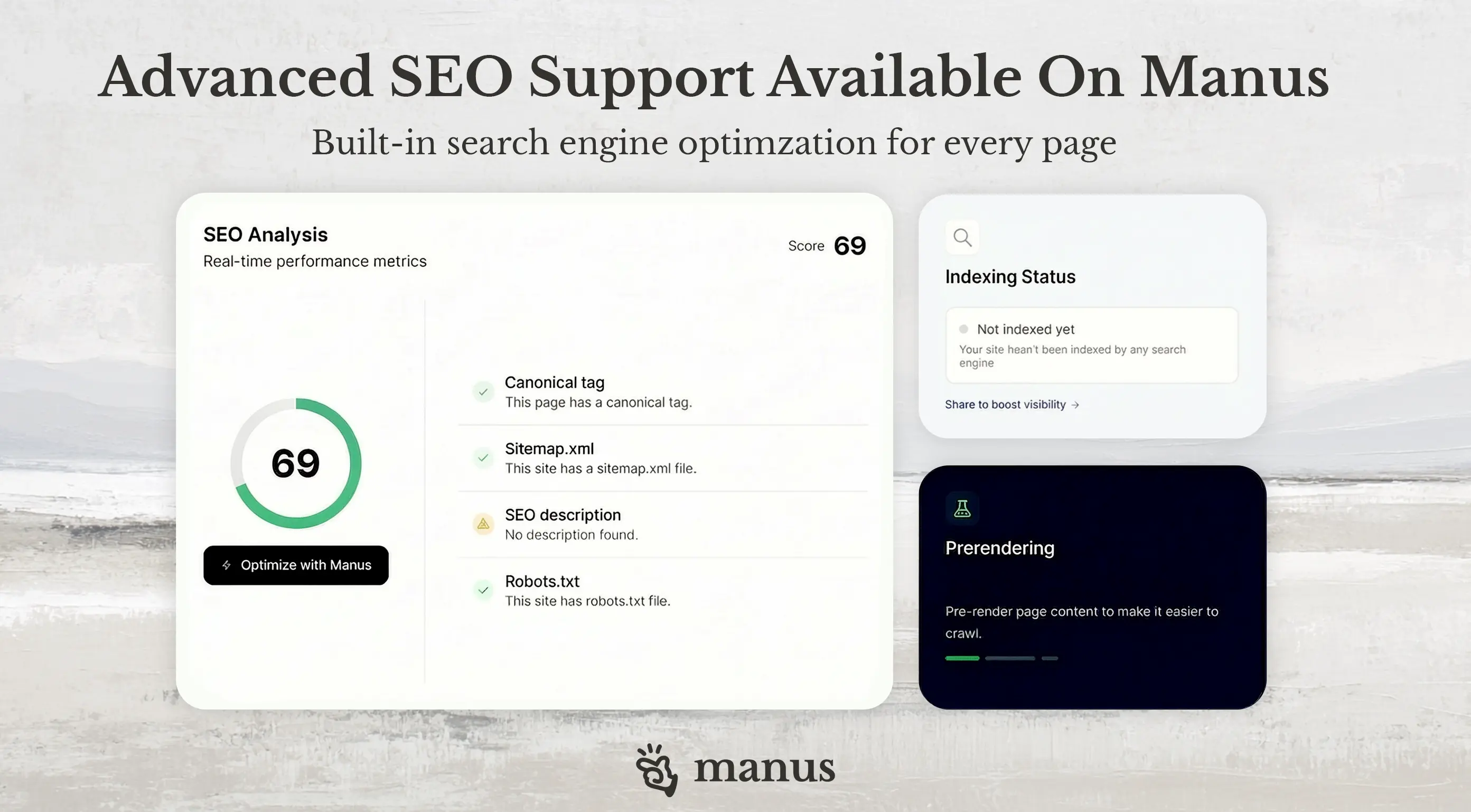 •Automatic Prerendering: Manus automatically generates and serves a lightweight, fully-optimized HTML version of your site to all major search engine bots, ensuring every page can be crawled and indexed on search engines correctly.
