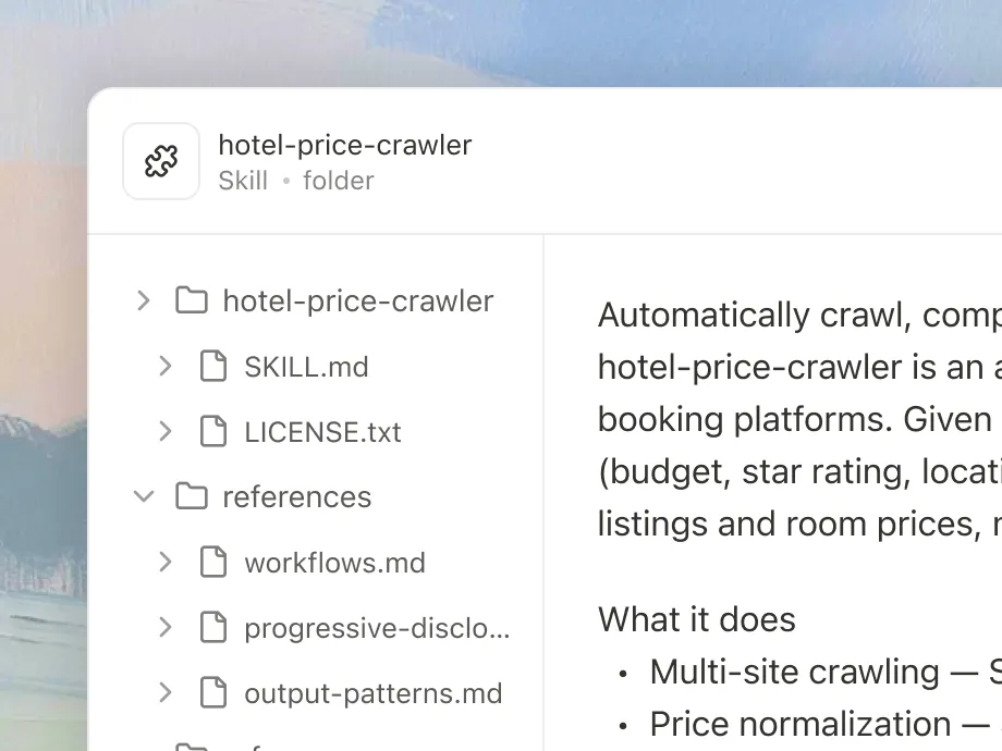 Real-world example — A market research skill can browse websites, analyze data with Python, and generate reports automatically.