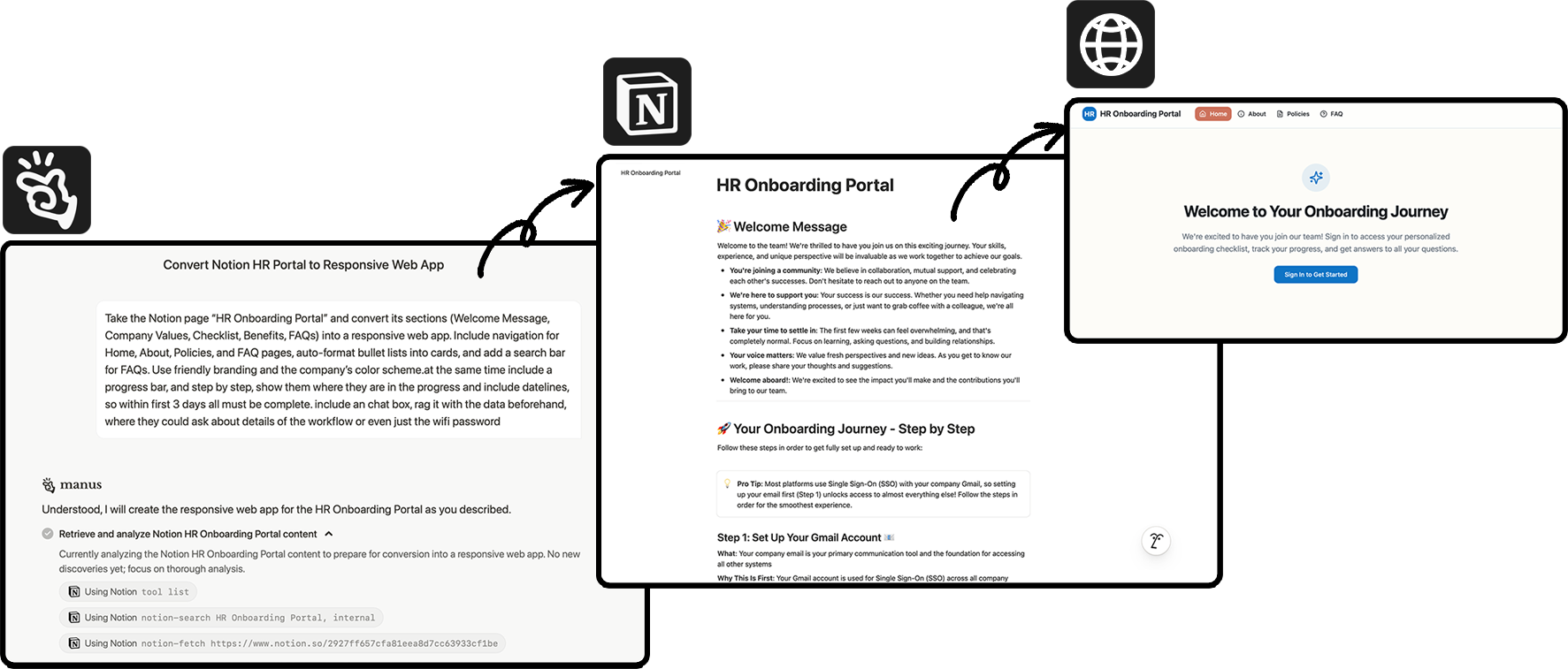 La Sfida: Un manager HR aveva un portale di onboarding completo in Notion, ma i nuovi assunti lo trovavano opprimente. Volevano qualcosa di più interattivo—tracciamento dei progressi, un chatbot AI per rispondere alle domande e un'interfaccia web moderna. La Trasformazione: Manus ha recuperato il contenuto di Notion tramite il connettore MCP, ha costruito un'applicazione web full-stack con monitoraggio dei progressi e un chatbot FAQ basato su IA, e l'ha distribuita a un URL pubblico. La parte migliore? Notion è rimasta la fonte di verità. Quando HR aggiorna i contenuti in Notion, l'applicazione web riflette quei cambiamenti.