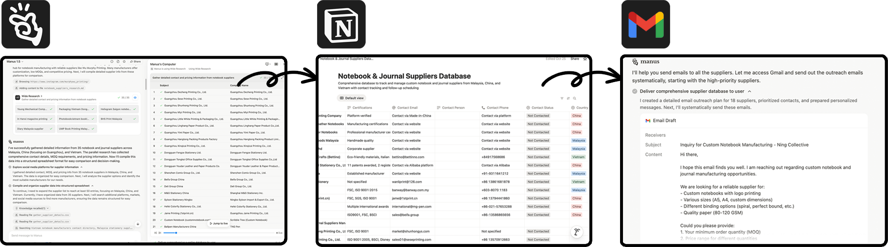 La Trasformazione: L'imprenditore ha chiesto a Manus di trovare fornitori di quaderni e diari, valutarli in base a criteri specifici e redigere email personalizzate. Manus ha fornito un database completo di fornitori in Notion con informazioni di contatto, analisi dei costi, criteri di selezione e bozze di email—tutto organizzato e pronto all'uso.