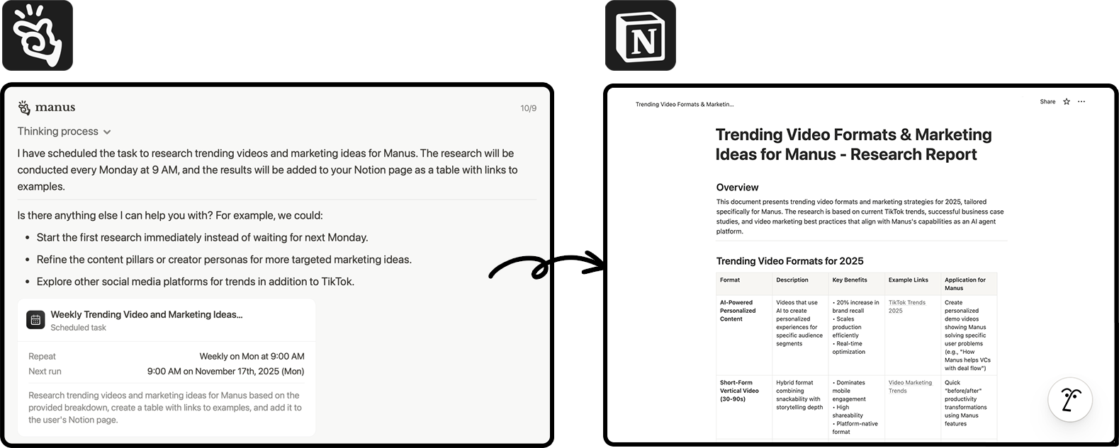 La Sfida: Rimanere aggiornati sulle tendenze di TikTok richiede un monitoraggio costante. Ogni settimana, qualcuno del team marketing doveva ricercare manualmente video, suoni e hashtag di tendenza, e poi fare brainstorming su come applicarli alle campagne. La Soluzione: Il team ha impostato un'attività ricorrente di Manus che viene eseguita ogni lunedì alle 9 del mattino. Manus ricerca le ultime tendenze di TikTok, identifica i contenuti virali e aggiorna il loro database Notion Trend Library con nomi di tendenze, link audio, video di esempio e idee di integrazione marketing.