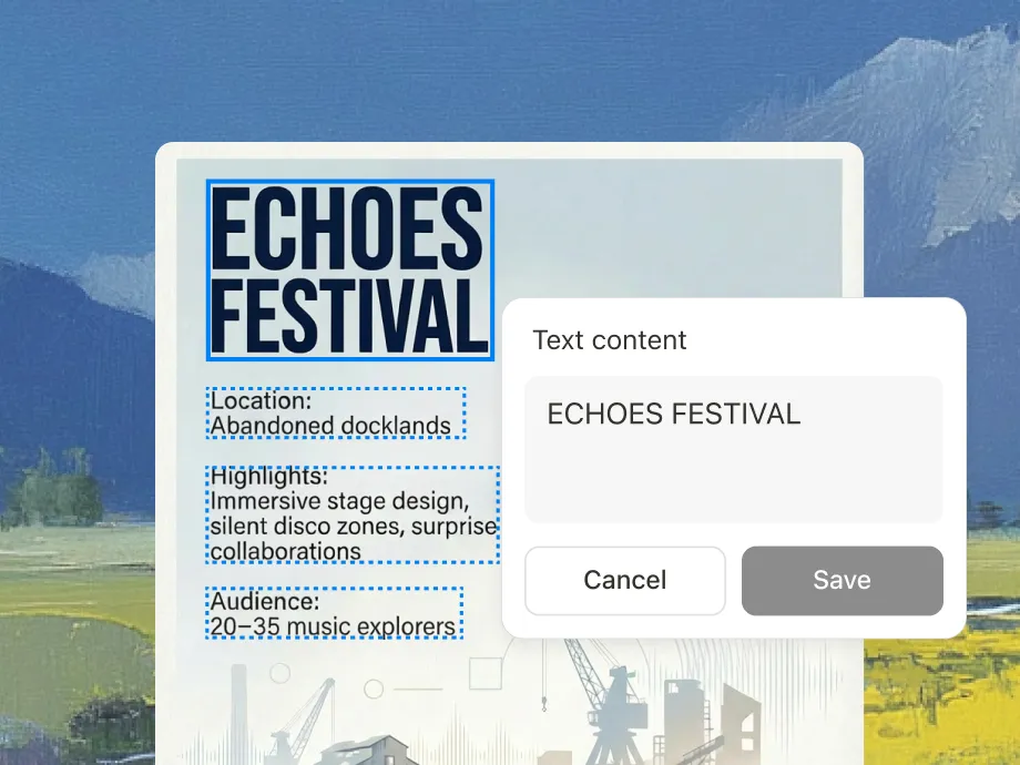 한곳에서 손쉽게 로고를 추가하고, 이미지를 혼합하며, 텍스트 오버레이를 적용하세요. AI가 조명과 원근감을 자연스럽게 맞춰 모든 요소가 조화롭게 어우러져 전문가 수준의 결과물을 보장합니다.