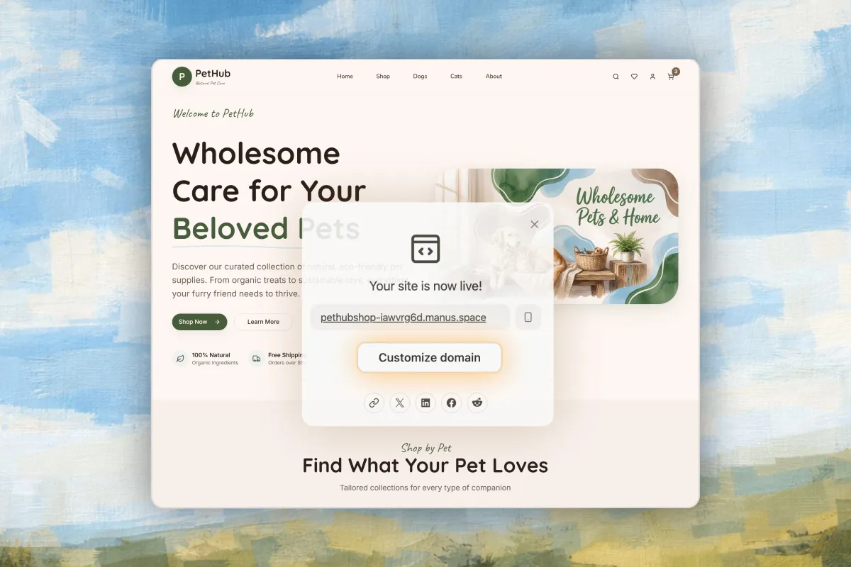 No templates. Manus creates unique, mobile-friendly designs with registration, databases, carts, and payments—built for your brand.